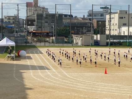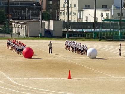 ラジオ体操をしたあと、団体競技の練習をしました。入場のしかたや競技のルールについて先生の説明を聞きました。
