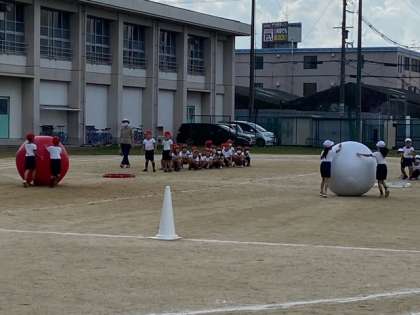 紅組・白組にわかれて、子どもたちの背丈ほどもある大きな「たま」をころがしてみました。
