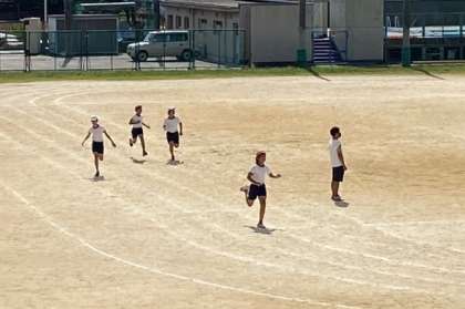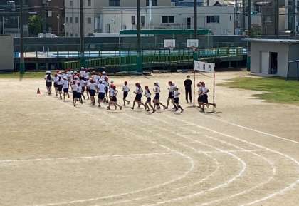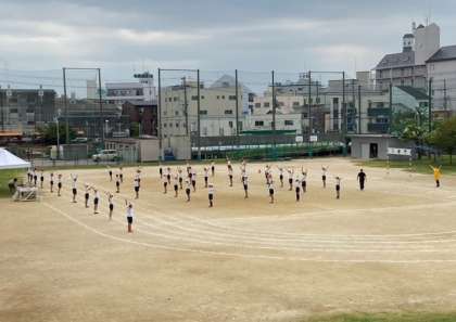 まずラジオ体操です。次に、個人競技の練習です。入場門でからスタート位置までかけ足で移動し、トラックを走りました。