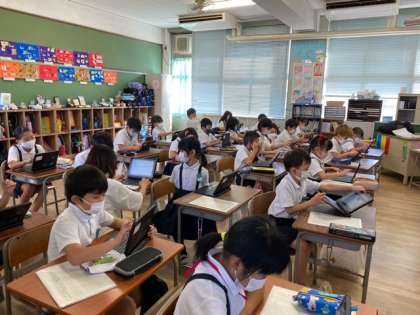 今日は、デジタルドリル支援員の訪問があり、子どもたちに、デジタルドリルの使い方を支援してもらいました。