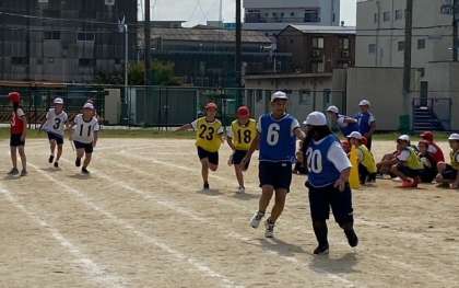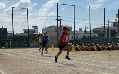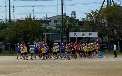 リレーの練習です。選手入場、第1走がスタート、バトンをつなぎます。バトンパスの練習の成果はどうでしたか。本番では悔いのない走りをしてください。