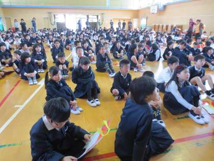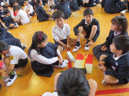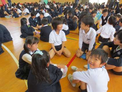 たてわり班ごとに輪になり、楽しく話し合っています。