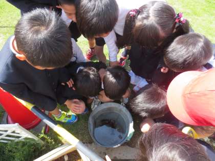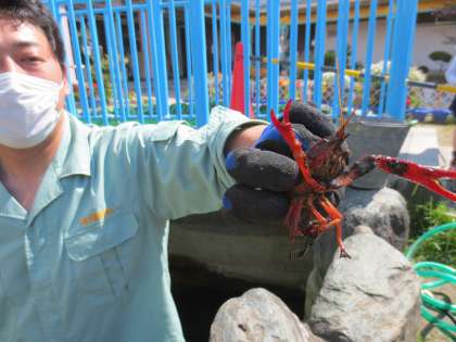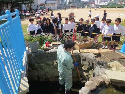 小さい方の池に土砂が堆積し、小川の流れがとまってしまったので清掃をしています。たくさんの子どもたちが見学にやってきて、ザリガニを見せてもっていました。
