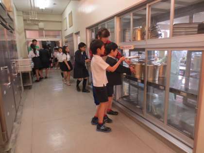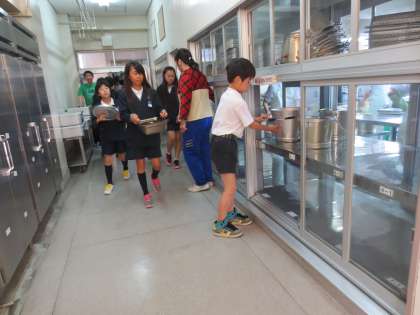 給食当番が食器などの返却をしています。どの児童も「ごちそうさまでした」と大きな声で、感謝のあいさつをしていました。