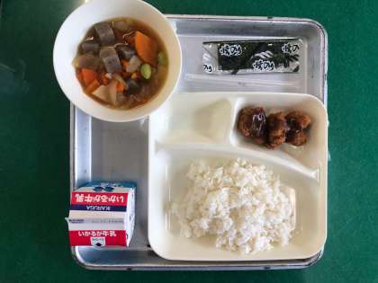 みそカツ、じゃがいもと野菜の煮もの、焼きのり、ご飯、牛乳