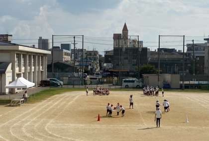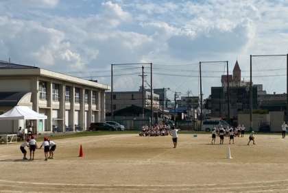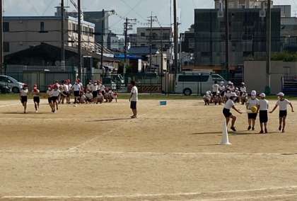 子どもたちが、軽快な音楽にのせて、団体競技の練習をしていました。