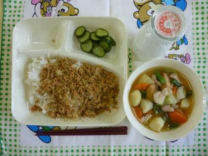 鶏肉と野菜の煮もの、きゅうりの甘酢づけ、紅ざけそぼろ、ご飯、牛乳