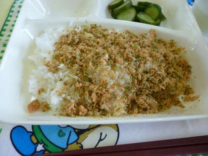 フレーク状の紅ざけといりごま、青のりをいため、料理酒、みりん、うす口しょうゆで味つけしたものです。ご飯にかけて食べます。