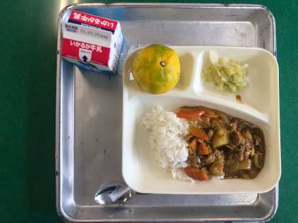 豚肉を主材にしたカレーライスです。今月は「食物アレルギー個別対応サポート月間」です。小麦にアレルギーのある児童も食べられるように上新粉(米粉)を使ったカレールウで仕上げています。