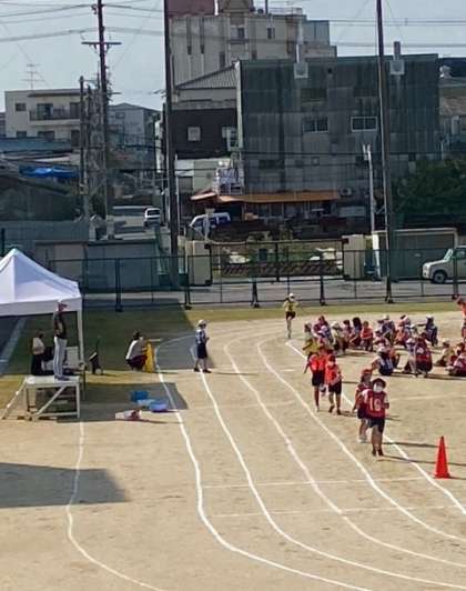 リレーの練習です。スムーズにバトンがつながるようになってきました。トラック一周を快走しています。全力お片付け(団体競技)の練習もしました。