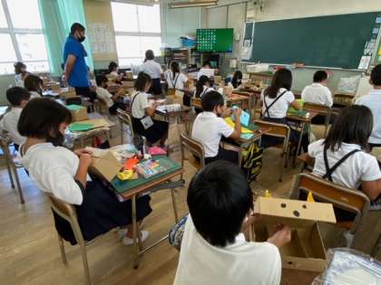 2組の図画工作科は「おもしろダンボールボックス」です。かたぬきダンボール紙を使って箱を組みたてています。