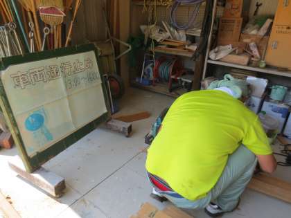 児童の安全のため、登下校時に学校西交差点に設置して自動車の通行を止めています。この移動式看板が、かなりいたんでいたので管理作業員さんが新しく作っています。