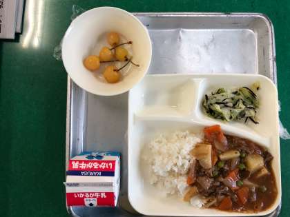 ハヤシライス(米粉)、キャベツのひじきドレッシング、さくらんぼ(缶詰)、牛乳