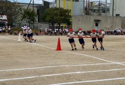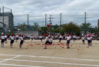 1年生、玉入れしながら子どもたちが変身(へんしん)しています。ほほえましいです。
