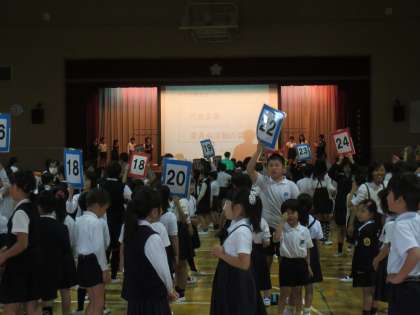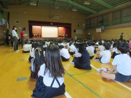 全校児童がたて割り班で講堂に集合しています。先週4/23に編成したばかりですが、とてもスムーズに集合できています。