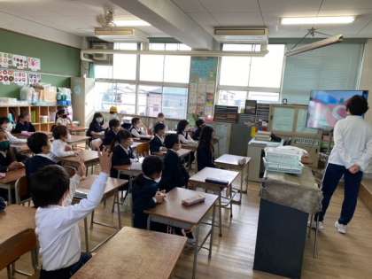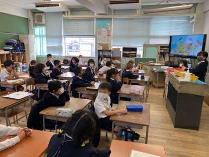 2年生の教室では、子どもたちが、大型テレビに映る絵を見ながら英語を聞いていました。