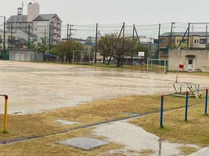 降り続く雨で運動場は水浸し、使用禁止の赤い旗が立っています。