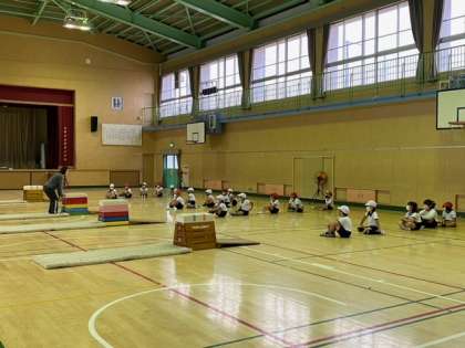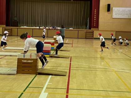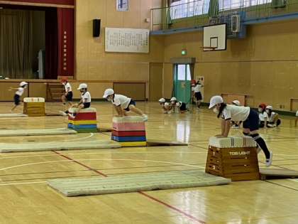 体育館で、子どもたちが「とびばこ運動」にチャレンジしていました。