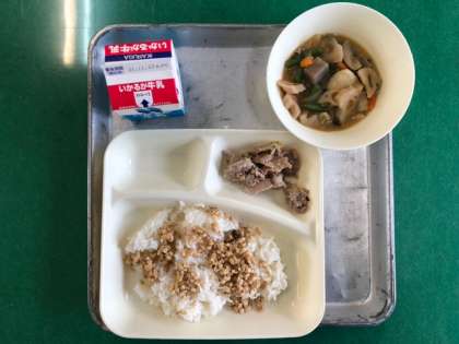 豚肉のねぎしょうゆ焼き、ふきよせ煮、ツナ大豆そぼろ、ご飯、牛乳
