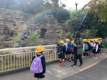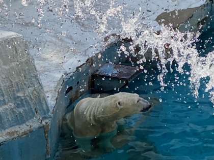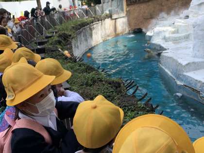 ホッキョクグマが水の中から顔を出しました。子どもたちが喜んでいます。もう一頭は水から上がって飛び込みをしました。すごい迫力でした。