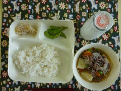 肉じゃが、もやしのゆずの香あえ、枝豆、ご飯、牛乳