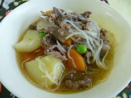 牛肉を主材にじゃがいも、糸こんにゃく、たまねぎ、にんじん、グリンピースの入った煮ものです。
