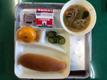タンタンめん、きゅうりの甘酢づけ、みかん、パン、いちごジャム、牛乳