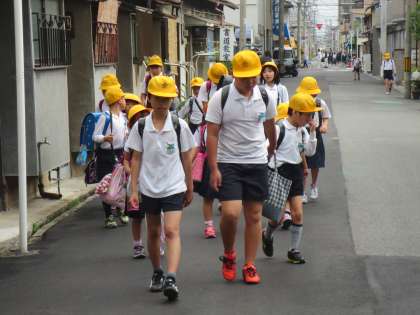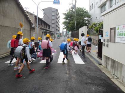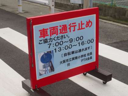 連休あけの朝、子どもたちは少しねむたそうに登校をしていました。安全な登下校のため、新しくなった真っ赤な「車両通行止め」の看板が、学校西交差点に立ててあります。
