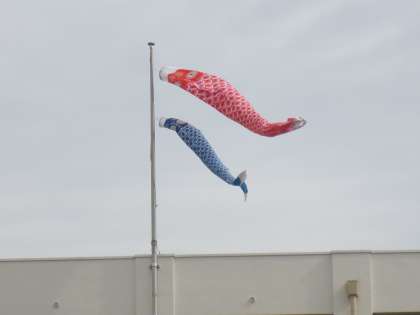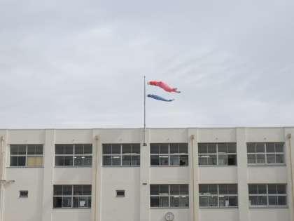 青空の中、元気よくおよいでいます。子どもたちは、連休中の大きなけがもなく、元気に運動場で遊んでいました。