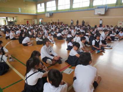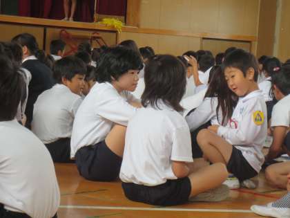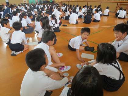 たて割班で輪になって考えています。「ぼくわかったよ」