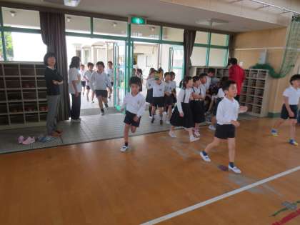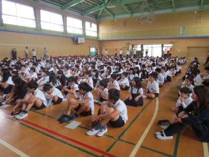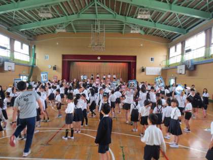 集会に児童たちは、講堂に集まってきました。講堂では班長がプラカードで集合場所を示しています。