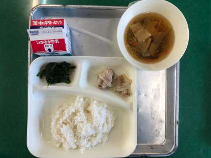 鶏肉のゆず塩焼き、ソーキ汁、ほうれんそうのおひたし、ご飯、牛乳