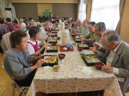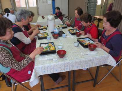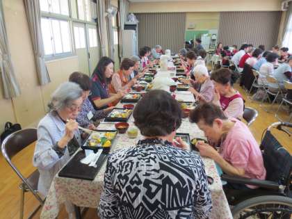 この事業は、巽南高齢者食事サービス委員会の方々が、地域の高齢者の方をお招きし、楽しいゲームやお話をして、食事をサービスする事業です。高齢者の方々はとても楽しみにしておられます。巽南連合振興町会会長の松下さんをはじめ、各町会長さんも来賓として出席されていました。【本校の多目的室にて】