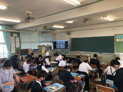 6年生の教室。図画工作科の木版画の作品づくりをしていました。彫る方向を考えながら何度も板を動かして彫り進めました。たいへん集中していて、「シーン」とした教室では木版画を彫る音だけ聞こえてきました。