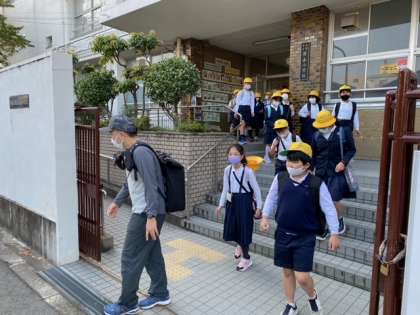 今日は4年生の遠足です。鶴見緑地へ行きます。