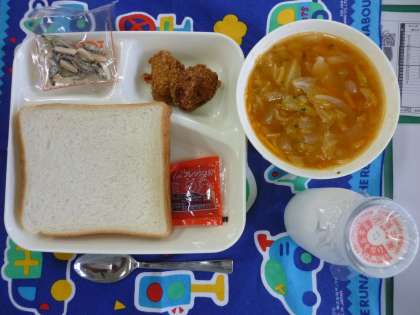 一口トンカツ、フレッシュトマトのスープ、アーモンドフィッシュ、食パン、いちごジャム、牛乳
