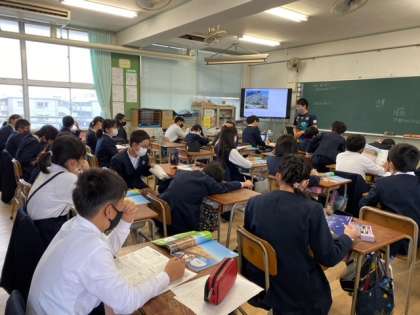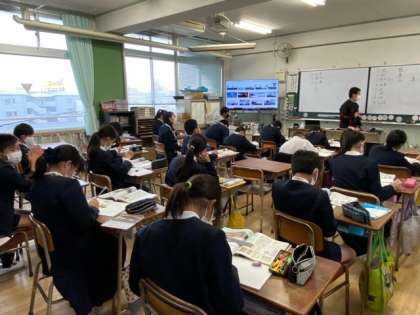 理科は、新巽中学校の先生が教えてくれます。「大地のつくりと変化」について大型テレビに映された写真も見ながらプリントに書きこんでいました。