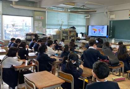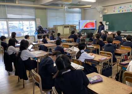 3年生の教室では、テレビ画面に流れる単語を見ながら英語で歌を歌っていました。「Rain, rain, go, away, Come again another day. …………」