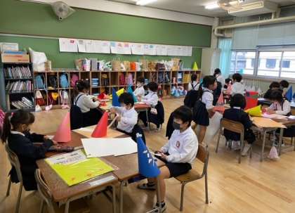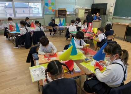 画用紙で「おしゃれなぼうし」をつくっています。飾りつけも自分たちで考えています。