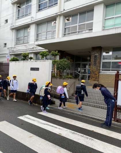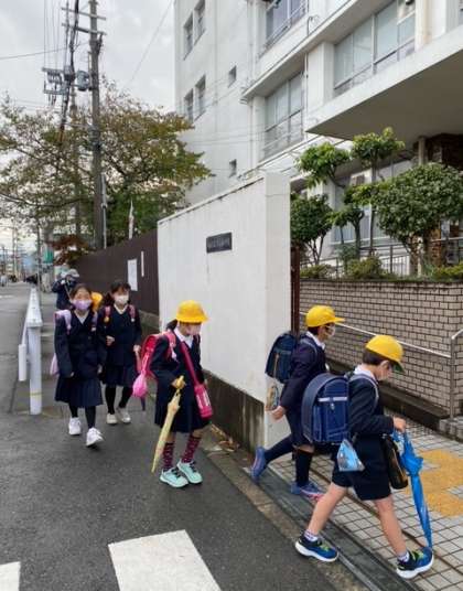 雨上がり、集団登校の子どもたちです。元気よくあいさつをしています。