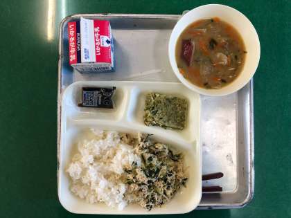 お好み焼き、豚汁、とりなっ葉いため、ごはん、牛乳