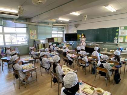 1年生の教室を見ると、子どもたちが、手を合わせて「いただきます」とあいさつをしていました。よく噛んで食べています。