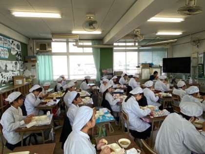 6年生の教室です。子どもたちが、前を向き、静かに給食を味わって食べていました。