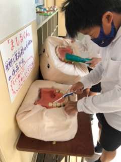 6才臼歯がはえた「まもるくん」の歯をみがいてくれています。
