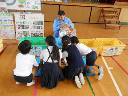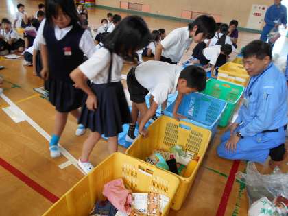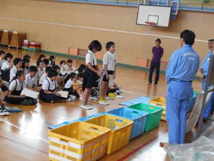 ゴミの分別がいかに大切かを知り、自分たちでも分別ができるか体験しました。最後にお礼のことばを代表の子どもがしっかりと話しました。