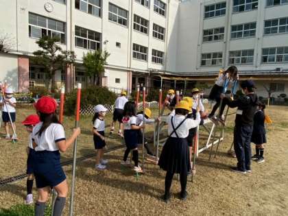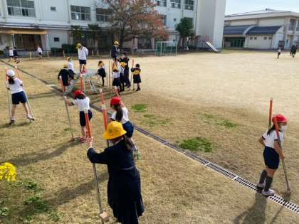 運動場で「竹馬」をしています。先生に助けてもらいながら練習している姿もありました。