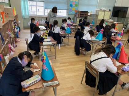 図画工作科の作品「おしゃれなぼうし」が出来上がり、かんしょうカードを書きました。ともだちの作品のよかったところを書いています。