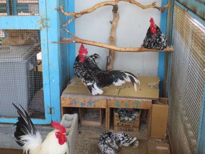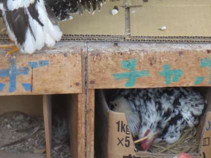 2羽ともお母さんチャボのそばをはなれませんが、人が見ていないところで、ひよこたちは元気にえさを食べています。