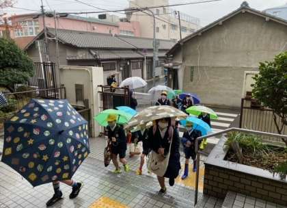 雨が降っています。子どもたちが傘をさして登校してきました。残念ですが、5年生の遠足は延期になりました。