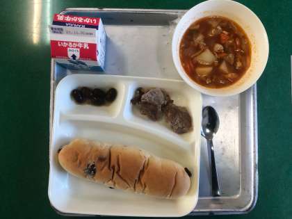 豚肉のガーリック焼き、ケチャップ煮、うずら豆のグラッセ、パン、牛乳